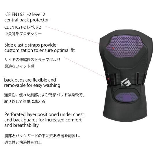 背骨のカバー範囲を広げ、通気性のあるファブリックを採用し、激しいライドでも快適な着心地を提供